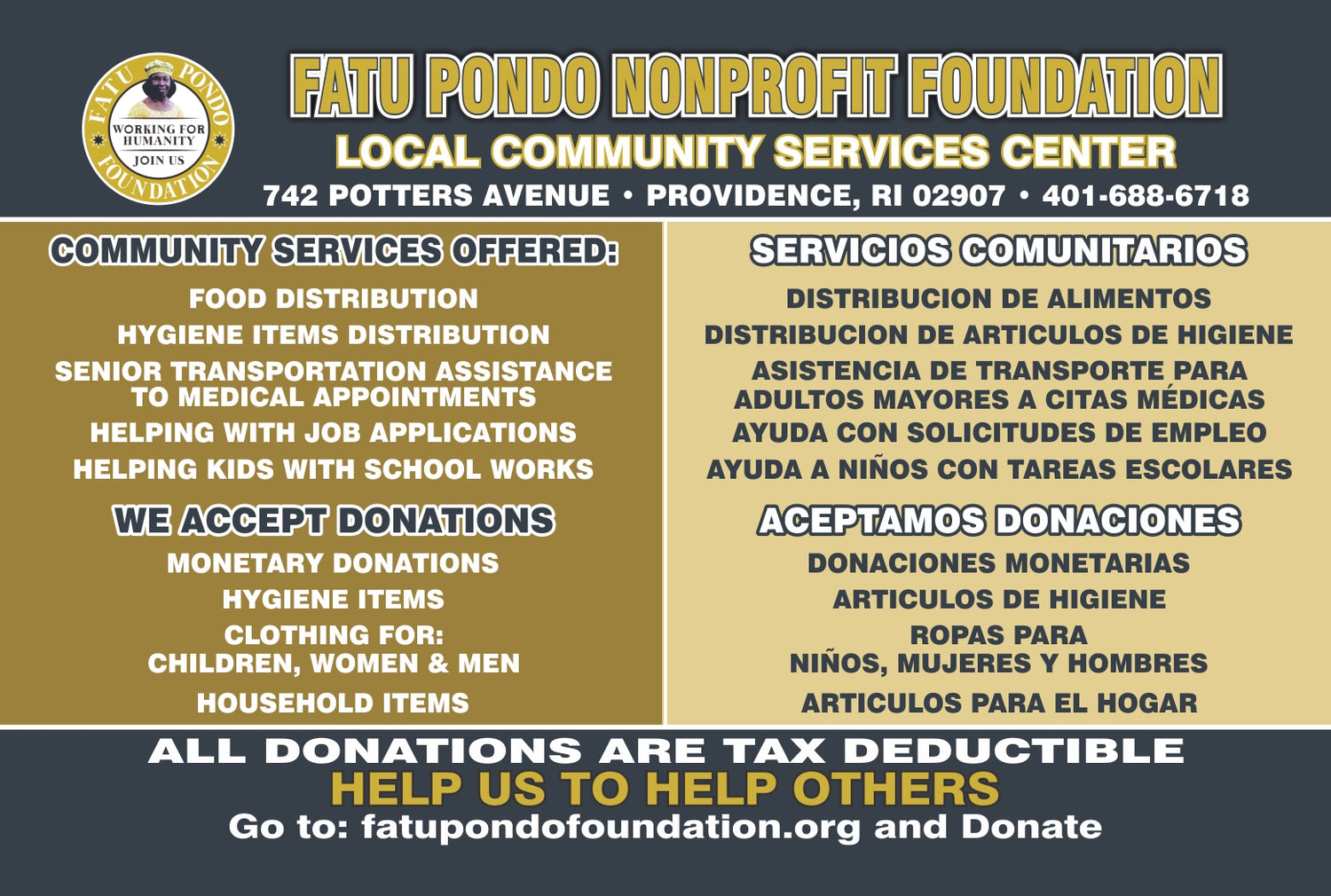 Besides the services in Liberia, west Africa, Fatu Pondo Foundation also renders local community humanitarian services to all nationalities in Providence, Rhode Island. Our humanitarian services have no boundaries.